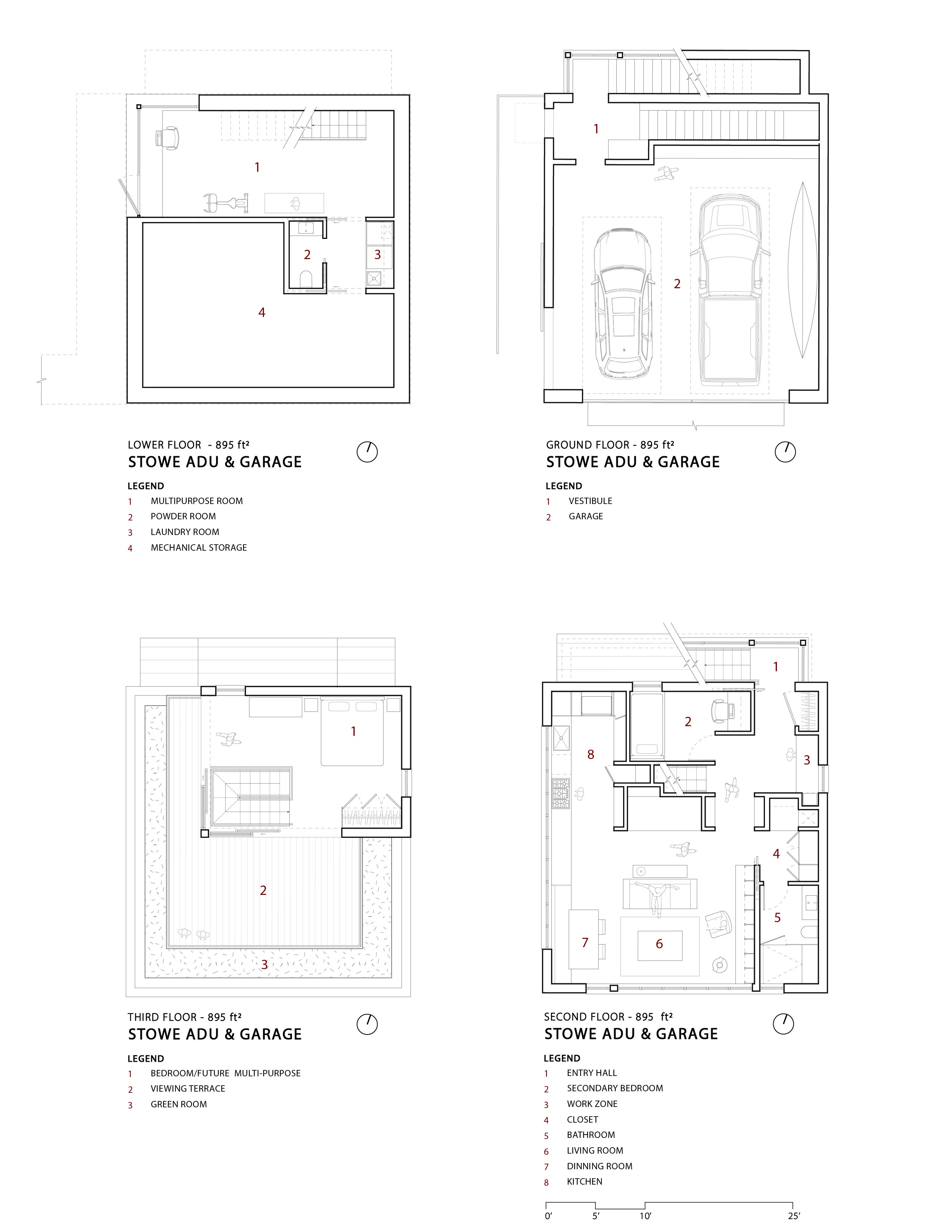 As part of the scope for a single-family residence in the mountains of Vermont, we were also tasked with designing an accessory dwelling unit (ADU) that the clients could reside in while the main house was under construction, and use as a guest house once complete. With industrial metal-framed windows, pale cladding and a geometric form, the building is intended to both complement the style of the larger house, and stand out as an architectural feature in its own right.